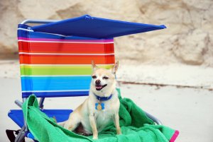 Another big day at “Camp Sammy.” Here’s Sammy chillin’ at the beach in the cool chair and shade his parents got for him and enjoying his birthday beach towel from Auntie Carol. Don’t worry about the tongue… his water is behind the chair in the shade. I think the tongue largely protects us from predators.