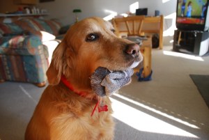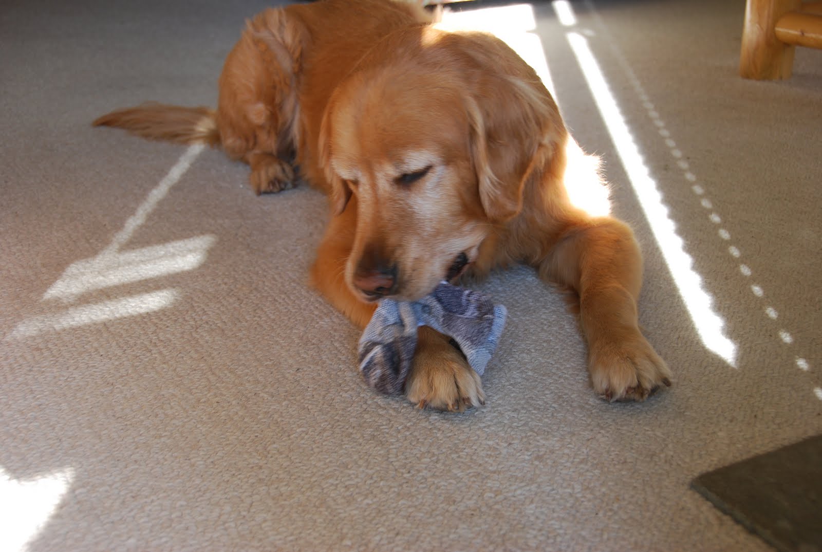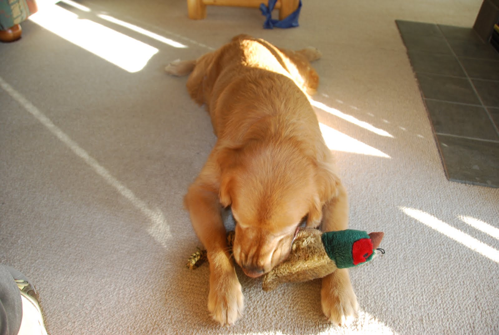 Sometimes the best toys are the simple ones… like Carol’s socks! They are soft and chewy, but alas, no squeaker. Finally it is back to the good old pheasant. Whatever the toy, we sure do have fun.